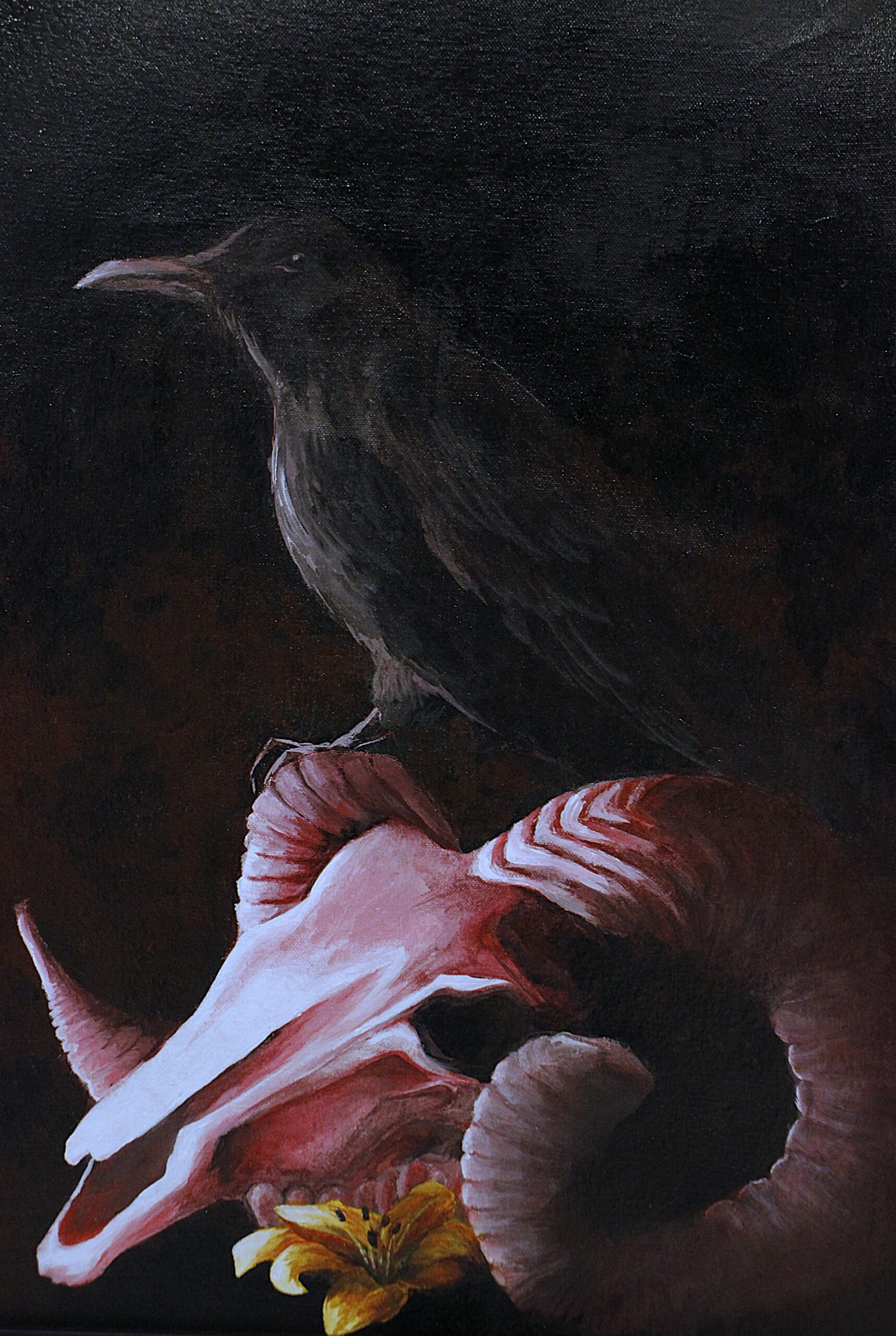 Assouvissement est une œuvre qui explore le rapport entre la survie et les cycles naturels. Le corbeau, un omnivore opportuniste et symbole de mort, se tient debout, fier, sur un crâne après l’avoir instinctivement grugé jusqu’à l’os. Il représente non seulement la mort, mais aussi l’adaptation et la capacité à saisir les opportunités qui se présentent devant nous pour survivre.