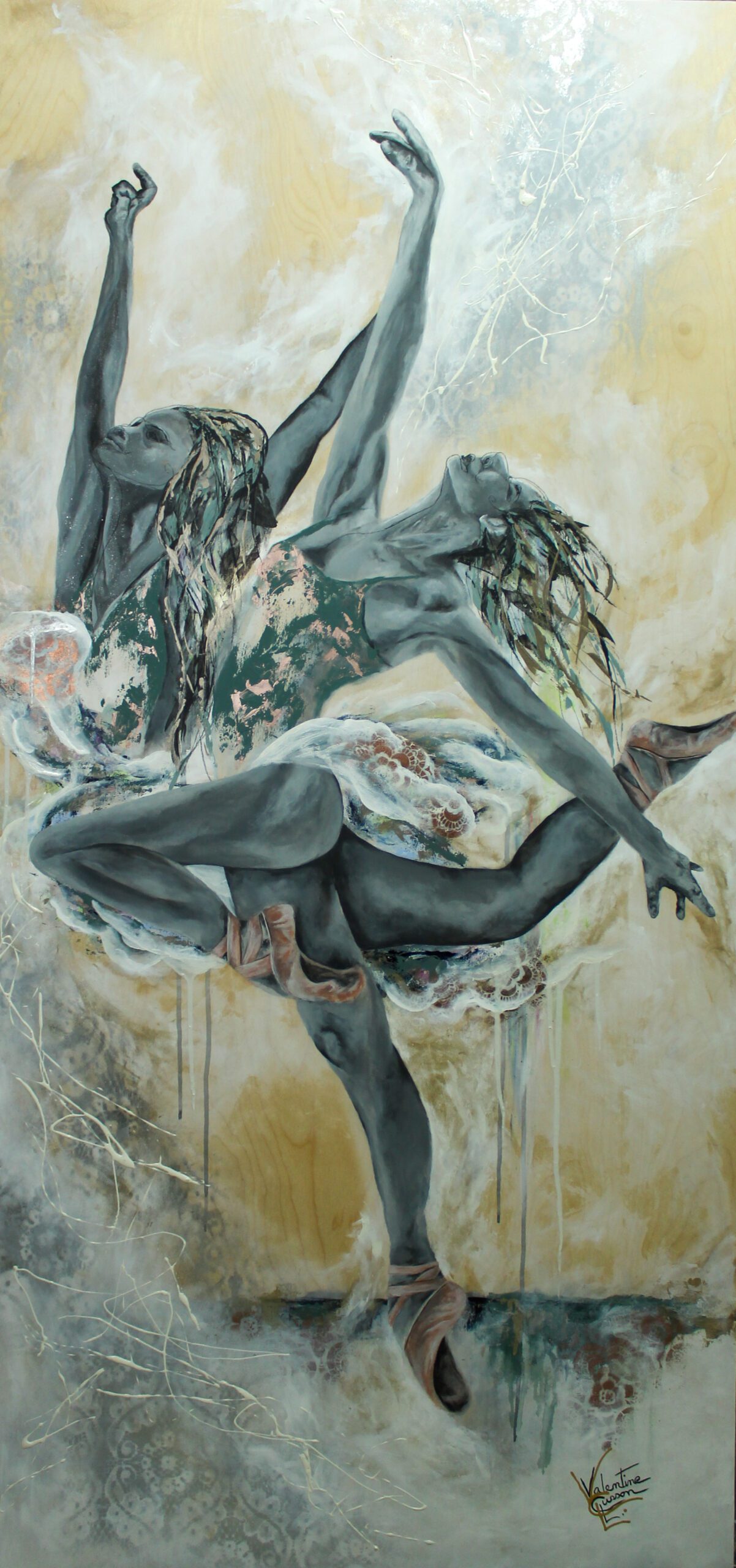 Ce tableau représente pour moi : prendre le dessus sur une perte de contrôle – La beauté qui ressort d’une épreuve – La multitude de mouvements commandés par un seul corps – L’apparence de calme d’une frénésie intérieure – La douceur qui émerge du bois brut – Il représente aussi toute la beauté de l’art, quel qu’il soit!