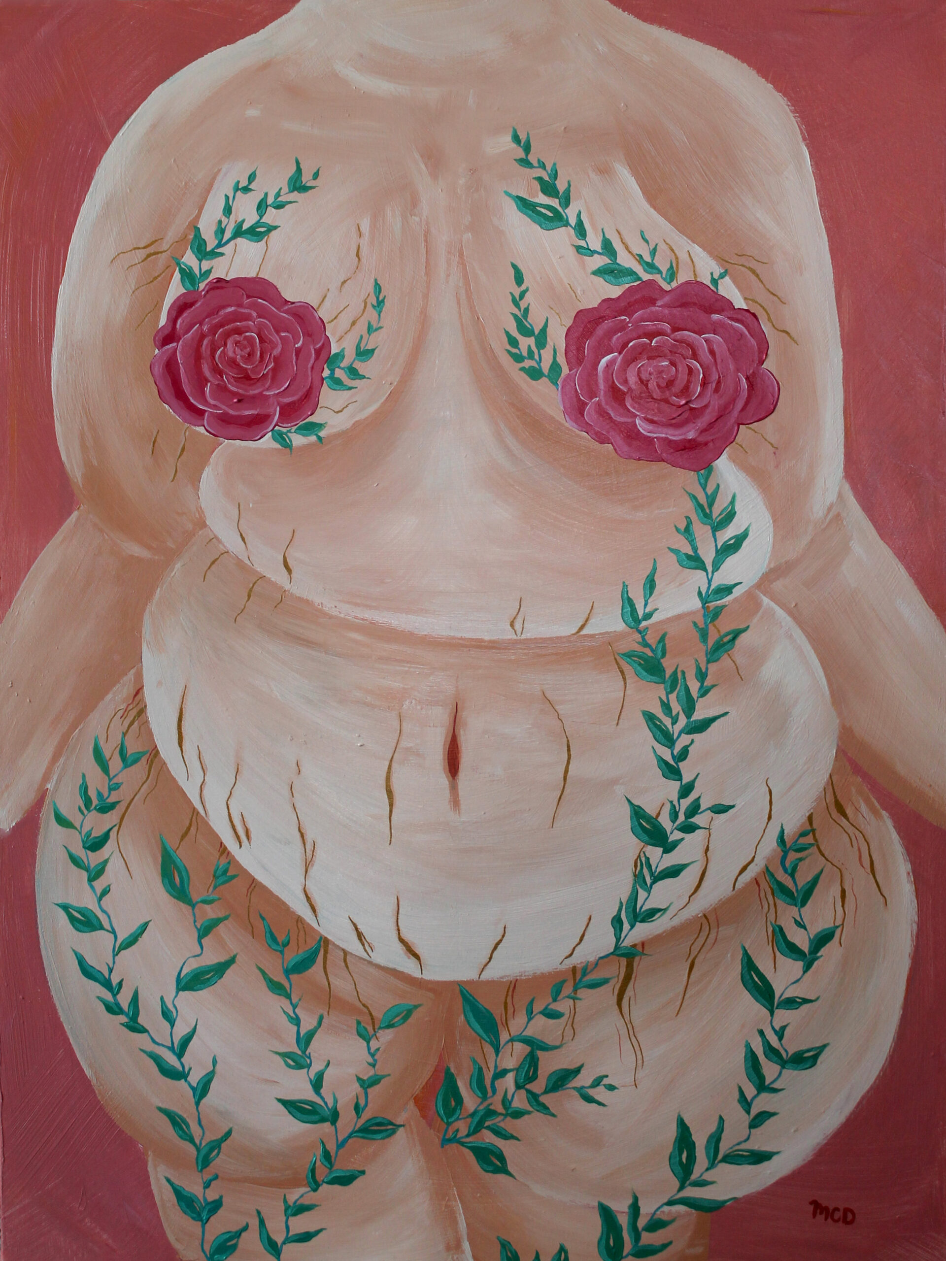 Je peux avoir des idées à n’importe quel moment de la journée. Je les appelle mes « flashs ». Parfois, ils me viennent en écoutant de la musique, parfois, c’est en faisant des tâches du quotidien comme m’habiller ou faire du ménage. La musique est souvent l’élément qui initie mes « flashs », car elle suscite des émotions et des sentiments intenses qui viennent me toucher profondément dans mon corps et dans ma tête. C’est pourquoi j’aime intégrer des paroles de chanson dans mes toiles. J’aime ce qui est étrange, j’aime jouer avec la déformation du visage et j’aime représenter des choses qui sont hors du commun dans mes créations. Je pense au corps, je remets en question les standards de beautés, surtout à la représentation du corps. J’essaie de trouver de la beauté dans tout ce qui m’entoure.
