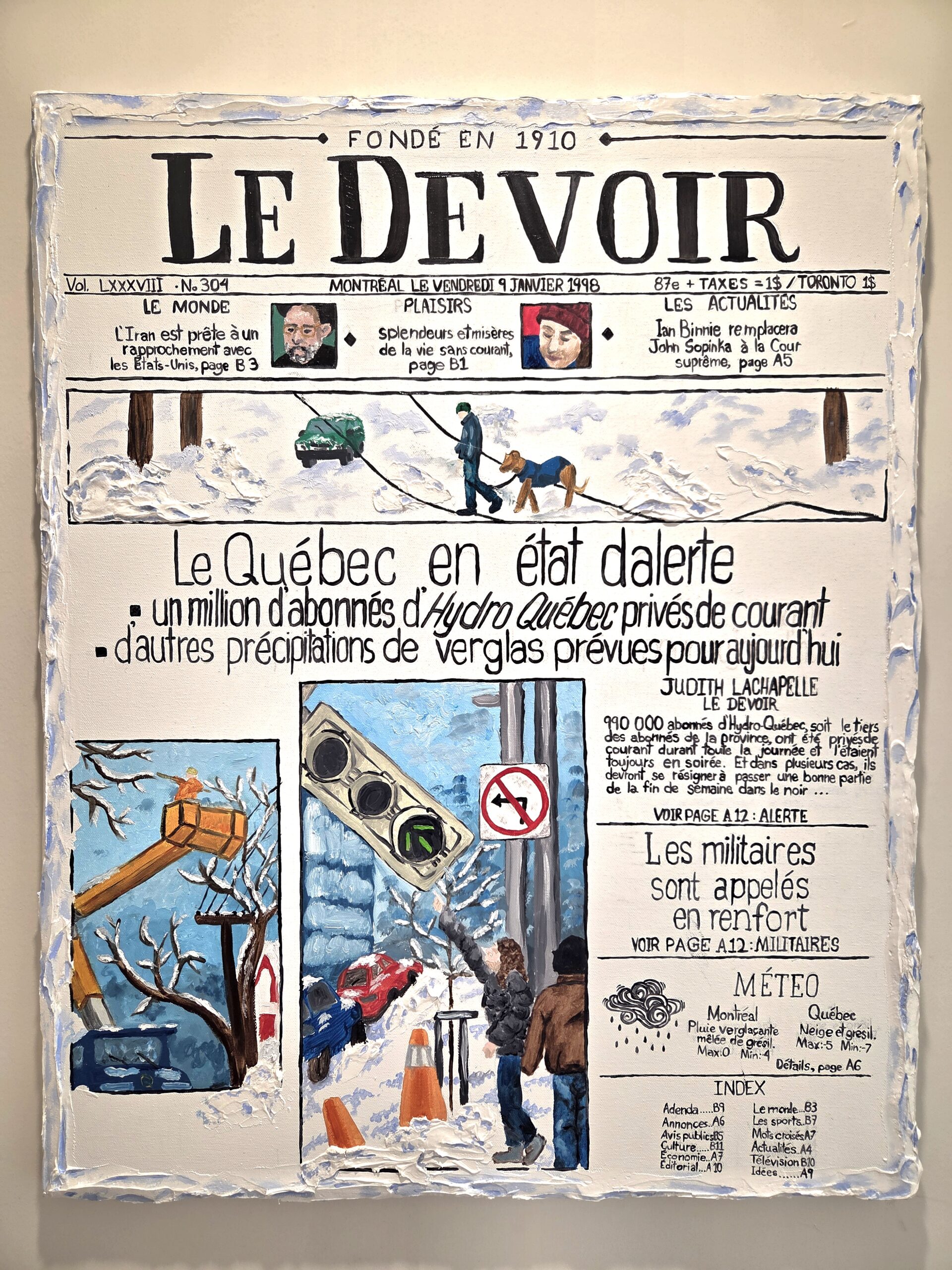 Mon œuvre du verglas de 1998 au Québec illustre un journal à ce sujet. Or, le sujet de ma peinture n’est pas ce que l’on perçoit à l’œil.