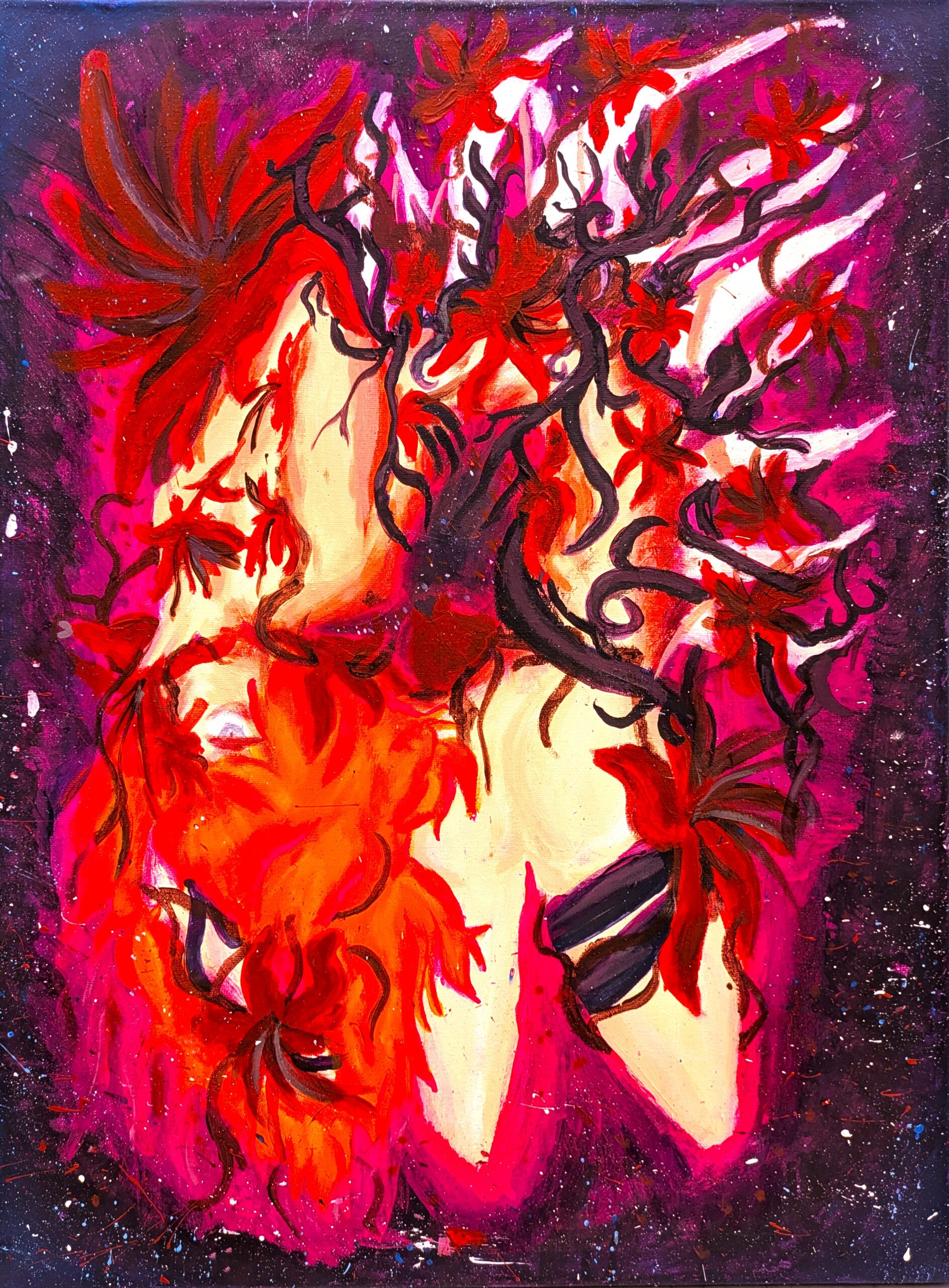 J’aime jouer sur les limites et je m’inspire beaucoup du gore pour mes créations. Pour cette exposition, je me suis amusée avec mon imagination, qui est parfois un peu tordue. Je vis pleinement mes émotions et les exprime dans mes œuvres. Cette fois-ci, j’exprime la solitude qui ronge de l’intérieur et la sensation d’être coincé et piégé. Je commence toujours par un croquis pour avoir une idée générale de l’œuvre, mais l’art ne va pas exactement où on le pense initialement et c’est en peinturant que l’œuvre prend réellement forme et vie.