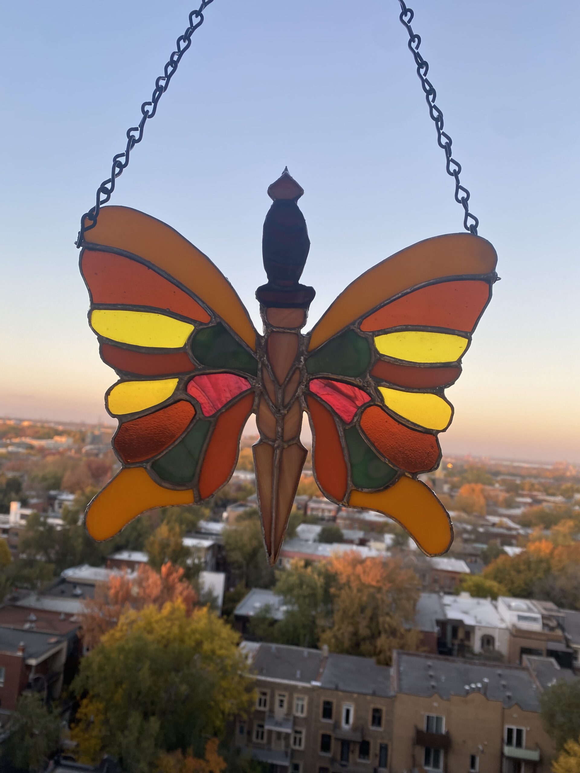 Dans la création de cette œuvre, j’ai beaucoup appris au fur et à mesure. J’ai conçu ce motif de vitrail moi-même, cependant c’était seulement ma troisième projet de vitrail, ainsi que la plus grande. Ceci a été un véritable défi. J’ai traversé des périodes de doutes et d’incertitudes, me demandant si j’allais réussir à donner vie à ma vision. Malgré ces luttes, j’ai persévéré, et au fil du processus, chaque pièce s’est assemblée harmonieusement. Chaque étape de création a été une leçon en soi, me poussant à sortir de ma zone de confort et à explorer mes limites. Ce parcours m’a permis de découvrir non seulement mes compétences techniques, mais aussi ma résilience. Finalement, voir le motif prendre forme et s’épanouir en une œuvre d’art a été incroyablement gratifiant, renforçant ma conviction que la beauté peut émerger même des moments de doute.