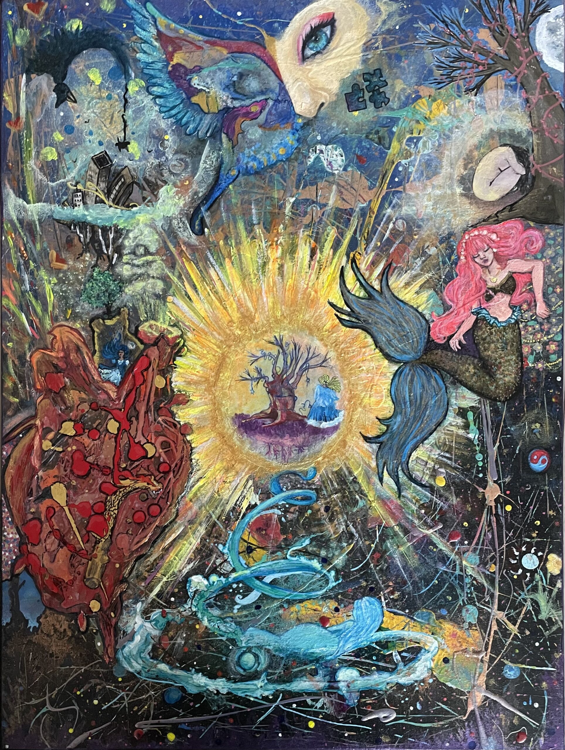 Une vague d’émotions qui a créé l’inspiration: La couche de fond a été faite dans l’intuition, un « dropping » de peinture avec des couleurs vives, mélangé de dessins effectués il y a quelques années, coupés et collés. Avec les couleurs et les formes, j’ai laissé l’imagination me porter. L’esprit a voltigé dans cette toile.