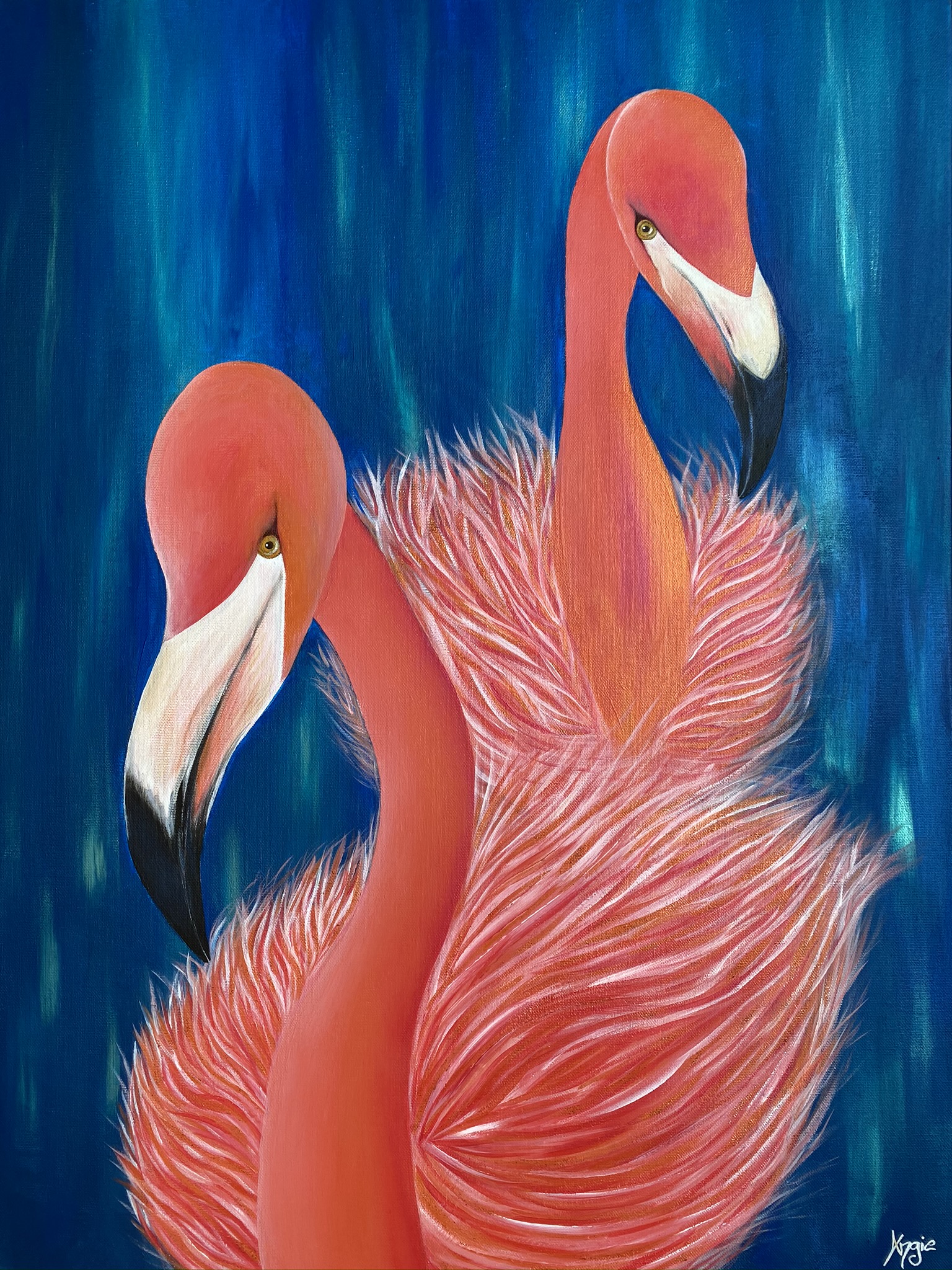 Ses personnages préférés : les animaux. Elle trouve en eux un amour sincère et pur. Elle leur donne vie en peignant un plumage qui danse au rythme des mélodies intemporelles de l’enfance, et un pelage aussi touffu que nos peluches préférées d’autrefois ! Ses créatures animalières ludiques s’animent avec une naïveté attendrissante, le regard scintillant, nées d’une imagination aux couleurs flamboyantes. Le mouvement qu’évoquent les innombrables coups de pinceau qui se superposent en toute fluidité, ainsi que les doux fondus qui se bercent à l’horizon, confèrent une âme à ses toiles.