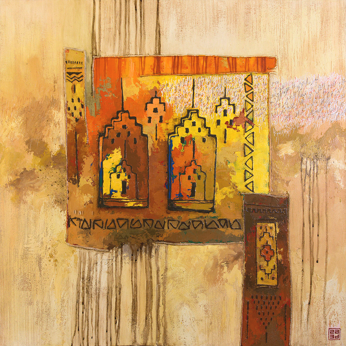 Quand je peins, j’essaie d’illustrer mes origines. Je me remémore mon vécu, mes souvenirs d’enfance, mes photos de voyage à travers mon pays, le Maroc.