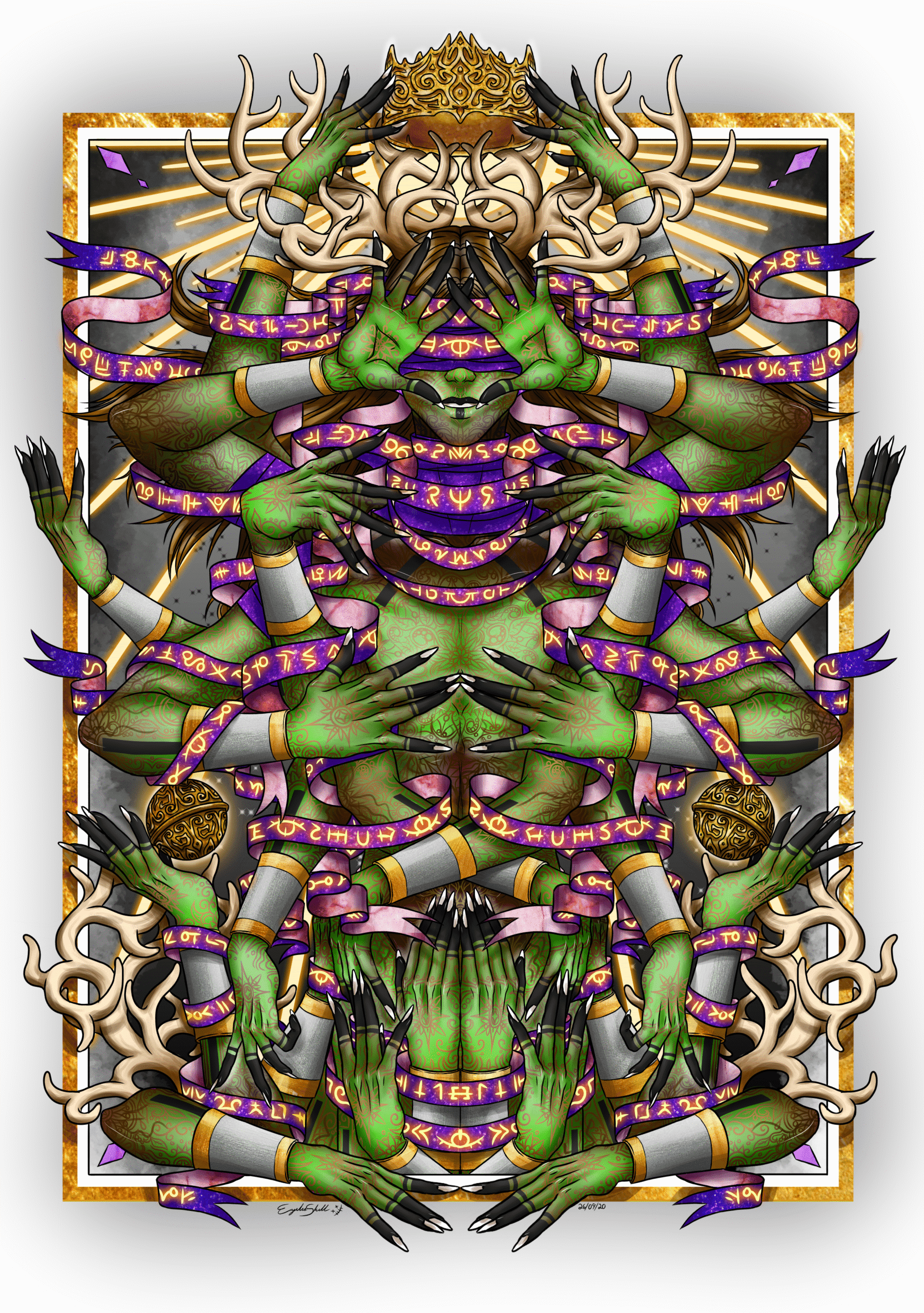 L’inspiration pour ma pièce est fortement liée à ma passion et mon amour pour le mystique, le fantastique et le concept divin. J’ai conçu cette pièce en mélangeant la photographie de textures (marbre, paillettes, métaux, etc.) avec le dessin graphique fait par ordinateur pour amplifier l’effet d’isolation divine habituellement représenté à l’aide de matériaux précieux. Je souhaitais également partager mon grand intérêt pour la nature en dédiant cette image à une figure surnaturelle complètement sortie de mon imaginaire. Cette créature, cet homme, est ma vision d’un dieu-roi de la forêt.