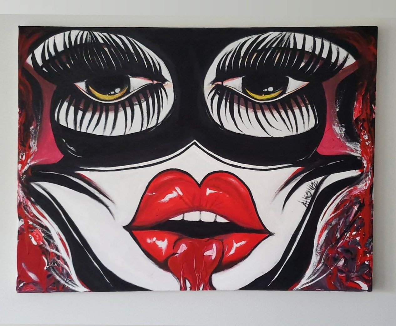 Peindre est une des manières de m’exprimer, d’extérioriser ce que je vis émotionnellement. Ça me permet de me recentrer et de lâcher lousse ma créativité. Je suis artiste maquilleuse aussi, donc cela se fait sentir à travers mes toiles ainsi que ce qui m’inspire au quotidien: les arts, la beauté, le maquillage, ce qui est glamour, les pinups, les drag-queens, ce qui peut toucher l’occulte et ce qui est psychédélique.