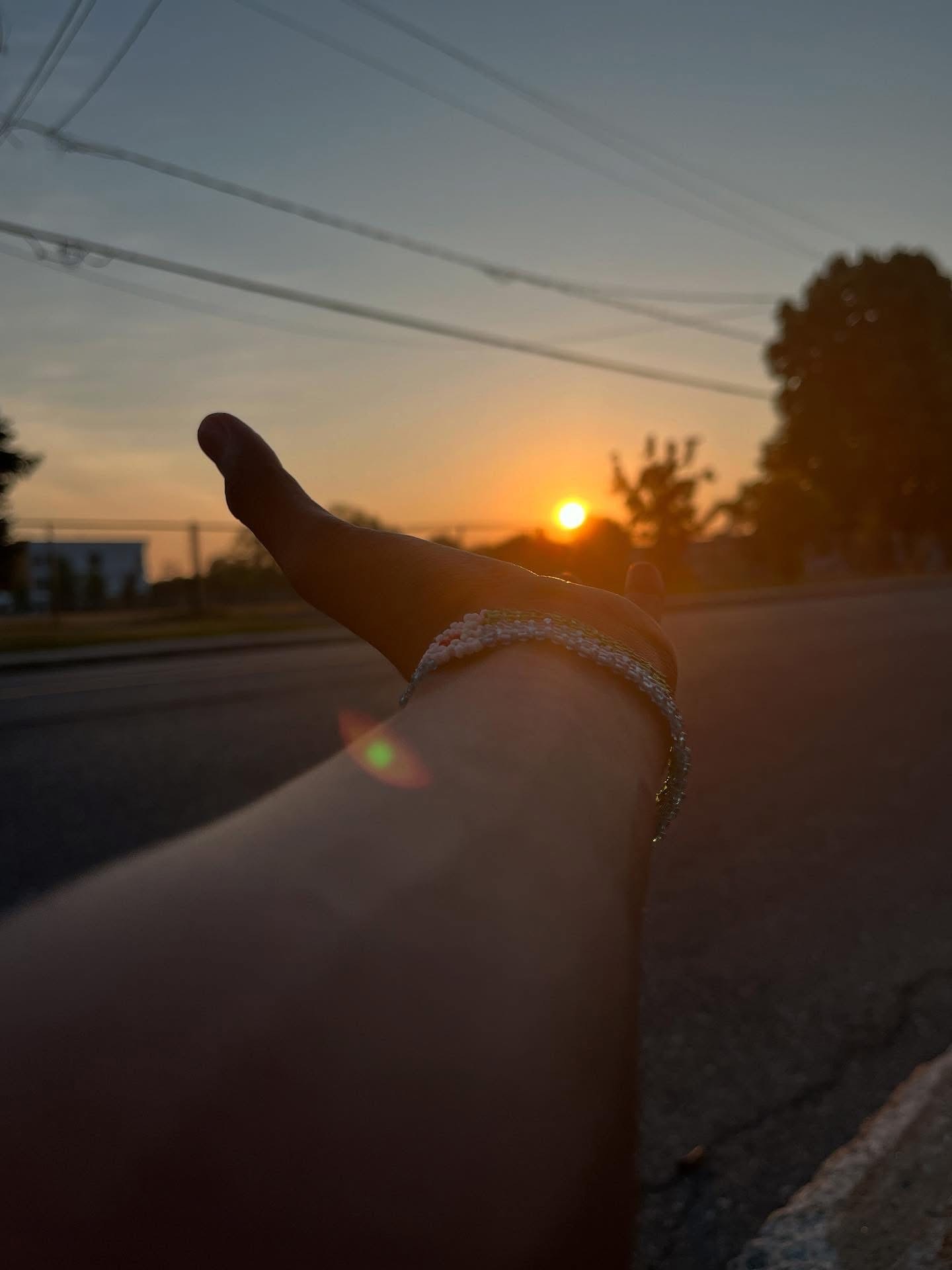 Cette image illustre la rencontre entre l’humain et la nature à travers un geste simple : tendre la main vers le soleil. La composition place le bras au premier plan, créant une ligne qui guide le regard vers le levé du soleil. Ce choix traduit une volonté de montrer la connexion directe entre l’individu et l’univers, comme si la lumière pouvait être saisie. Le contraste entre la route asphaltée et la chaleur du levé du soleil évoque la dualité entre l’espace urbain et la pureté naturelle. Les fils électriques, visibles en arrière-plan, rappellent la présence constante de la technologie, tandis que la lumière douce et dorée symbolise la sérénité et l’espoir. Cette photographie invite à réfléchir sur notre désir de maîtriser la nature tout en cherchant à en préserver la beauté.