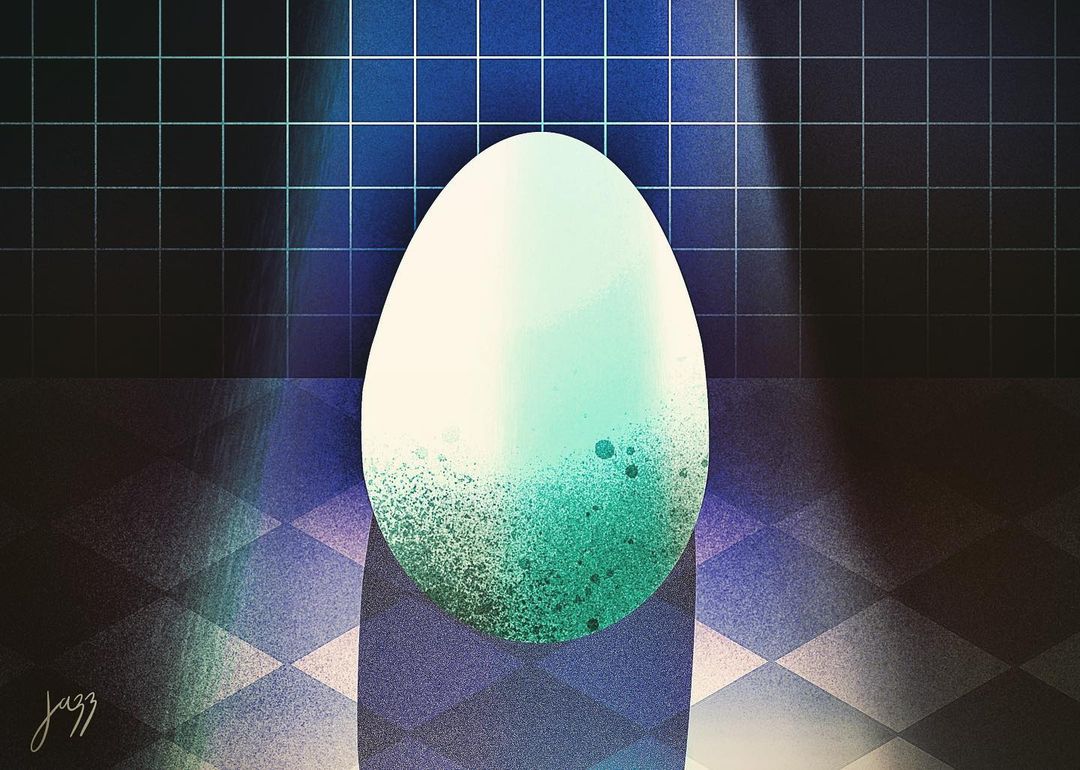 Ce tableau est une abstraction des sources de la vie comme objet d’admiration. Prendre l’œuf comme symbole des commencements, illuminé d’en haut, évoque un sentiment de révérence envers les plus petites choses. Peint sur iPad, dans le logiciel Procreate, imprimé sur toile tendue, et ajoutée des détails avec de la gouache à la gelée.