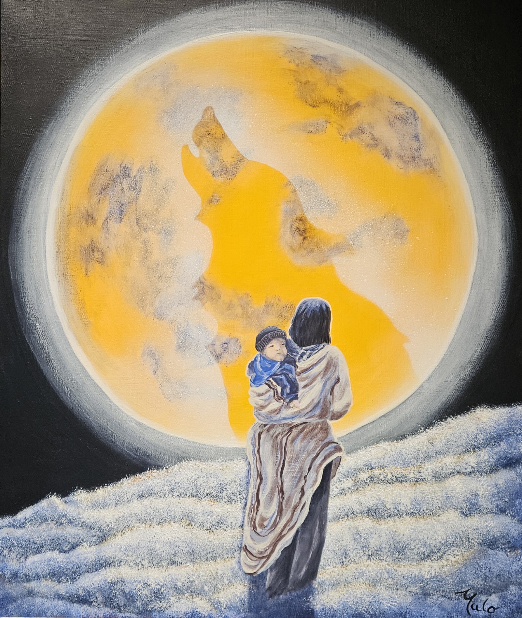 La présente œuvre a été créée à la suite de ma lecture du livre Tiohtiaike (2021) de Michel Jean, où j’ai appris que tous les chiens du nord du Québec ont été abattus dans les années 1950 et 1960. J’ai compris que ces animaux représentaient la famille, la survie et la sécurité du peuple Inuit. Étant moi-même une grande amoureuse des animaux, j’ai été choquée par cet événement historique tragique, qui a eu des conséquences de générations en générations. Voici le poème que m’a inspirée mon œuvre :