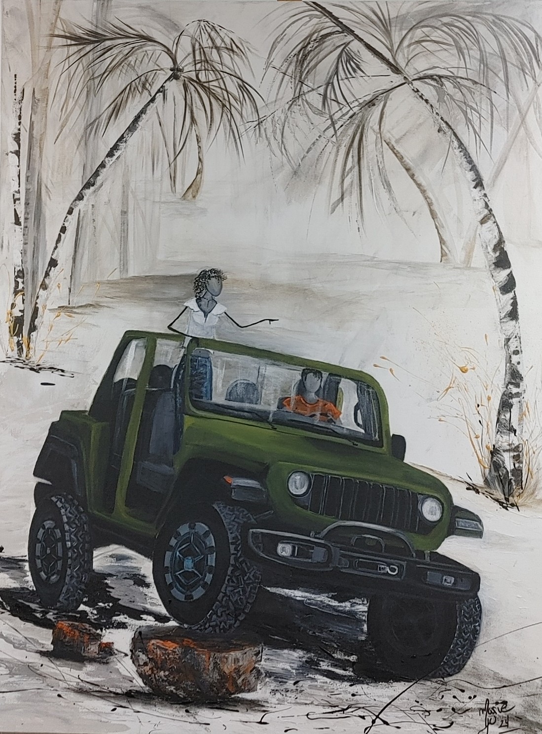 Marie-Jo est attirée par la liberté expressive de l’abstraction tout en restant connectée aux formes reconnaissables du monde réel. Ses œuvres sont souvent des compositions dynamiques où les contours des personnages s’entremêlent avec des fonds abstraits, créant un dialogue constant entre ce qui est perçu et ce qui est ressenti. Les personnages « bras allumettes », caractérisés par des corps épurés et de longues lignes élancées, incarnent cette tension entre la simplicité formelle et la complexité émotionnelle.