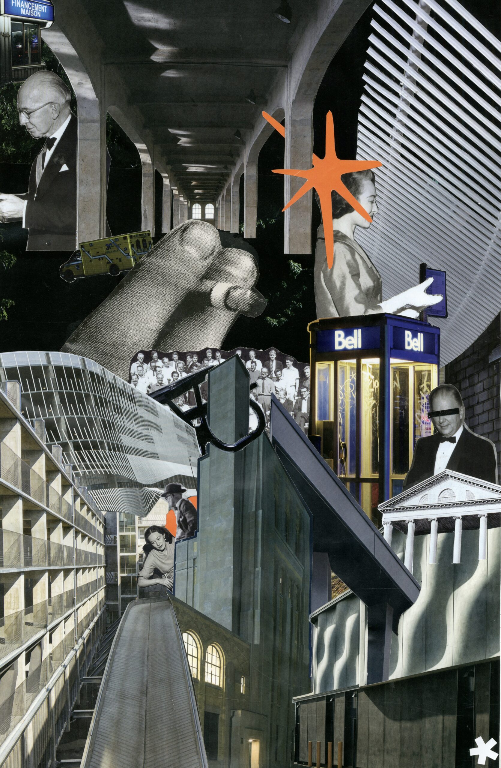 J’ai créé cette œuvre en 2023, lorsque je commençais une technique en design industriel. Avec ce type de technique, ça m’a permis d’avoir une autre perception des objets et des bâtiments que je voyais, autant avec les formes que les procédés de fabrication. Alors je me suis amusé à détruire et reconstruire des bâtiments (images) et d’autres choses que l’on voit tout les jours. J’ai fait beaucoup d’essais-erreurs pour avoir ce résultat, je plaçai et déplaçai les images jusqu’à ce que j’aime comme ils se chevauchent.