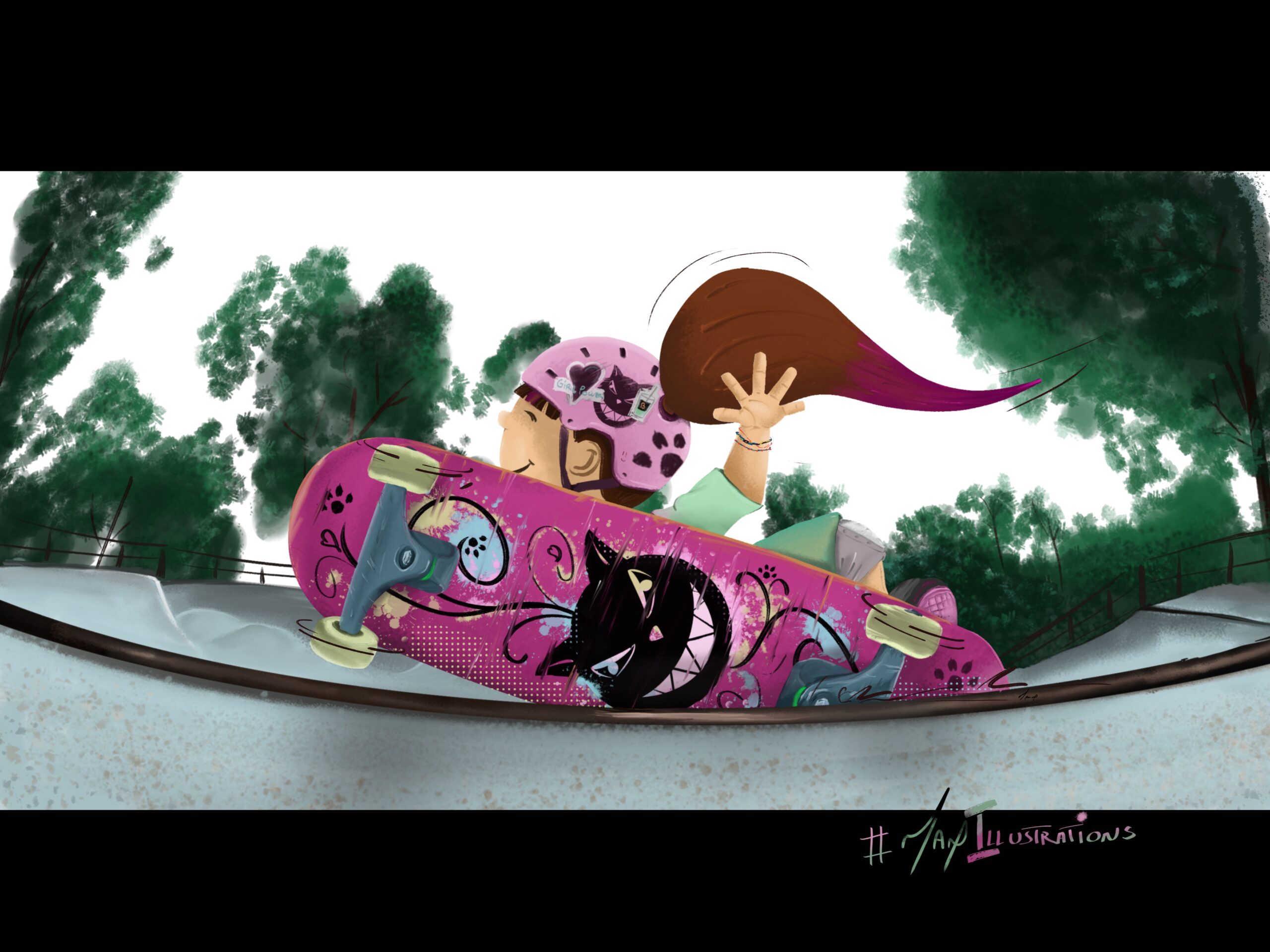 Mon illustration représente tout ça, une préado avec la petite fille en elle, mais fière de son identité »Girl Power » !! Un dessin coloré pour la joie de vivre et aussi l’artiste en elle, oui l’artiste, parce qu’elle a plus hâte de personnalisé sa planche que de performer pour des compétitions !!