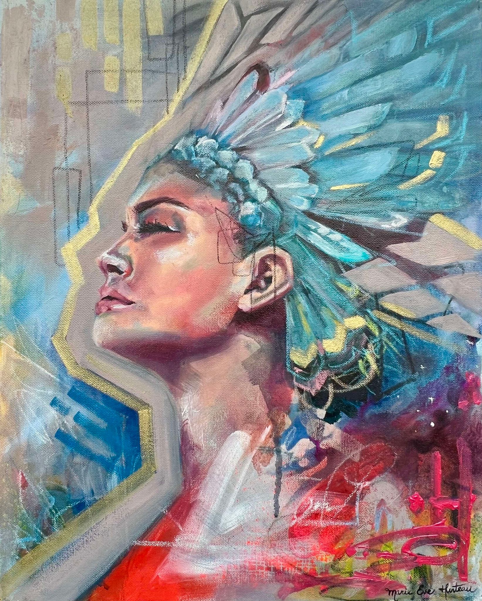 L’œuvre combine des textures abstraites et des détails figuratifs. Les coups de pinceau fluides représentent le vent, tandis que des couleurs vibrantes et des jeux de lumière mettent en avant la vitalité et l’énergie intérieure de la femme. Les médiums utilisés sont l’acrylique pour commencer, en passant par l’huile pour ajouter une profondeur et pour fournir l’ajout de marque fait par différents médiums pour ajouter ainsi le dynamisme que je ressens lorsque je réalise mes œuvres.